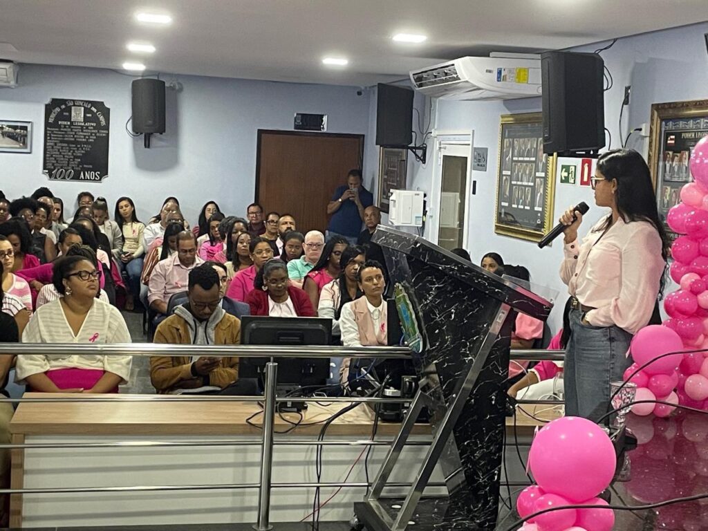 A Câmara de Vereadores de São Gonçalo dos Campos realizou uma sessão especial em alusão ao Outubro Rosa, campanha mundial dedicada à conscientização e prevenção do câncer de mama. O evento contou com a presença do prefeito Tarcísio Pedreira, do presidente da Câmara Gilson Cazumbá, da secretária municipal de Saúde Camila Farani, e do médico mastologista Dr. Julian Maurílio, além de vereadores, profissionais de saúde e representantes da comunidade.