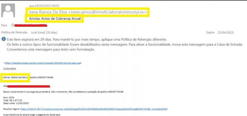 Por RafaMensagem fraudulenta tem como assunto 'Alerta de Débito Sanitário'