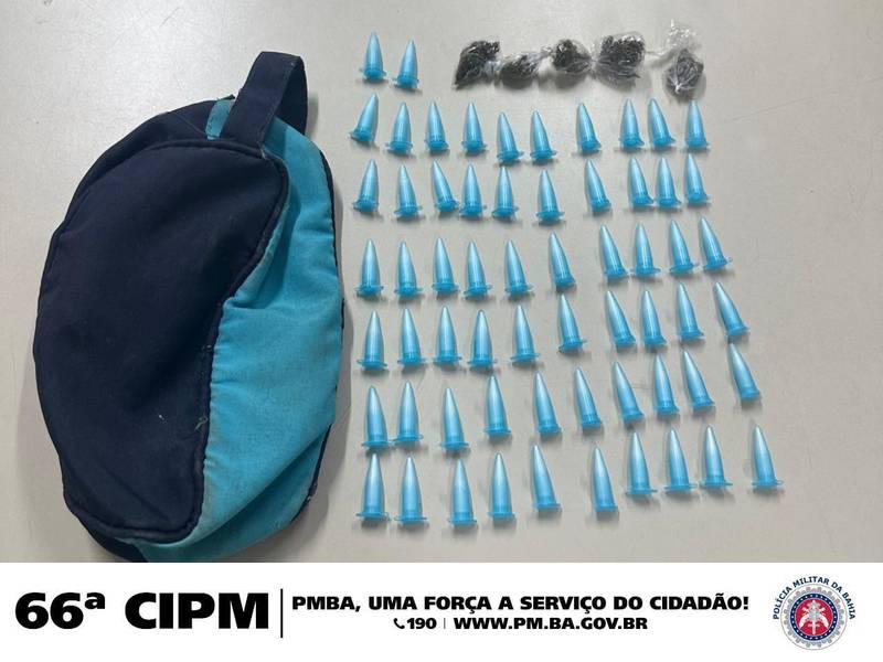 Ao proceder a abordagem na sacola foi encontrado cinco porções de substância análoga à maconha e 62 pinos com substância análoga a cocaína.